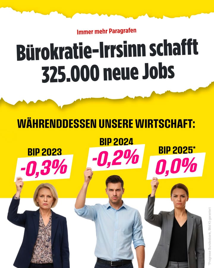 Wir benötigen sofort ein mindestens dreijähriges Moratorium für Bürokratie. Gesetze müssen häufiger mit einer sogenannten Sunset-Klausel zeitlich befristet und mehr mit Genehmigungsfiktionen sowie Stichtagsregelungen gearbeitet werden. Wenn eine Behörde nicht innerhalb eines bestimmten Zeitraums auf einen Antrag reagiert, muss der Regelfall künftig die automatische Genehmigung sein. Bürokratie-Monster, wie etwa die Bonpflicht: Ersatzlos streichen
